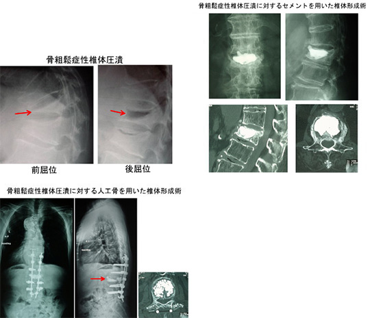 通常、脊椎の圧迫骨折は1〜2週間の安静で、痛みが楽になり、コルセットを2〜3ヶ月間装着してほとんど支障なく治癒する場合が多いのですが、骨粗鬆症に伴って生じる圧迫骨折では、椎体が完全に潰れてしまったり、骨癒合が遅れ、椎体が壊死してしまったり、不安定性を伴う痛みが続いたり、潰れた骨が神経を圧迫し、時間がたってから神経障害が生じたり、骨折に伴う変形(特に後弯変形)による障害が生じたりといろいろな問題を起こし、手術が必要になる症例が増えています。代表的な手術として